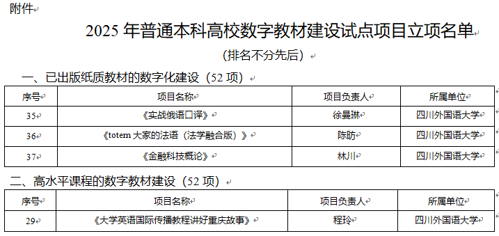 近日,重庆市教委公布2025年普通本科高校数字教材建设试点立项名单,888集团官网申报的《大学英语国际传播教程讲好重庆故事》等4个项目入选。四项教材紧扣“数字赋能”与“服务地方”双主线,聚焦国际传播和多语种融合的跨学科创新,内容覆盖英语、俄语、法语、法学及金融科技领域。